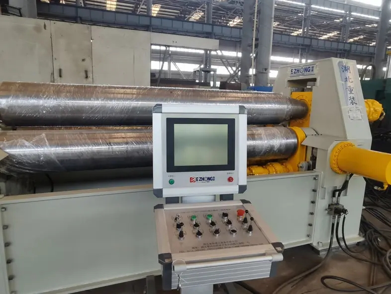 鄂重卷板機的上輥位于兩個下輥的對稱位置,通過液壓缸中的液壓油作用在活塞上進行垂直提升運動,主減速器的最終齒輪將兩個下鋼板滾子的齒輪驅動到網格上進行旋轉運動,為軋板提供扭矩。折彎機的扁平塑料金屬板穿過折彎機的三個工作輥(兩個下輥和一個上輥)之間。在上輥的較低壓力和下輥的旋轉的幫助下,金屬板通過多次通過。連續(xù)彎曲,產生永久性塑性變形,并滾入所需的圓柱體、錐體或部分。
