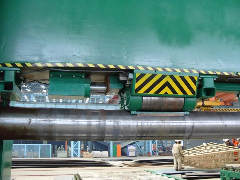 - 彎曲補(bǔ)償:上梁和上后備輥之間有一個(gè)可調(diào)節(jié)的備用輥裝置,或者底梁和底部后備輥之間有一個(gè)可調(diào)節(jié)的備用輥裝置,其功能是補(bǔ)償滾動(dòng)變形。該設(shè)備由柱塞式氣缸驅(qū)動(dòng)。補(bǔ)償負(fù)載由變形性能曲線設(shè)定,這保證了工件的高直線度,同時(shí)加工不同厚度和寬度的板材。